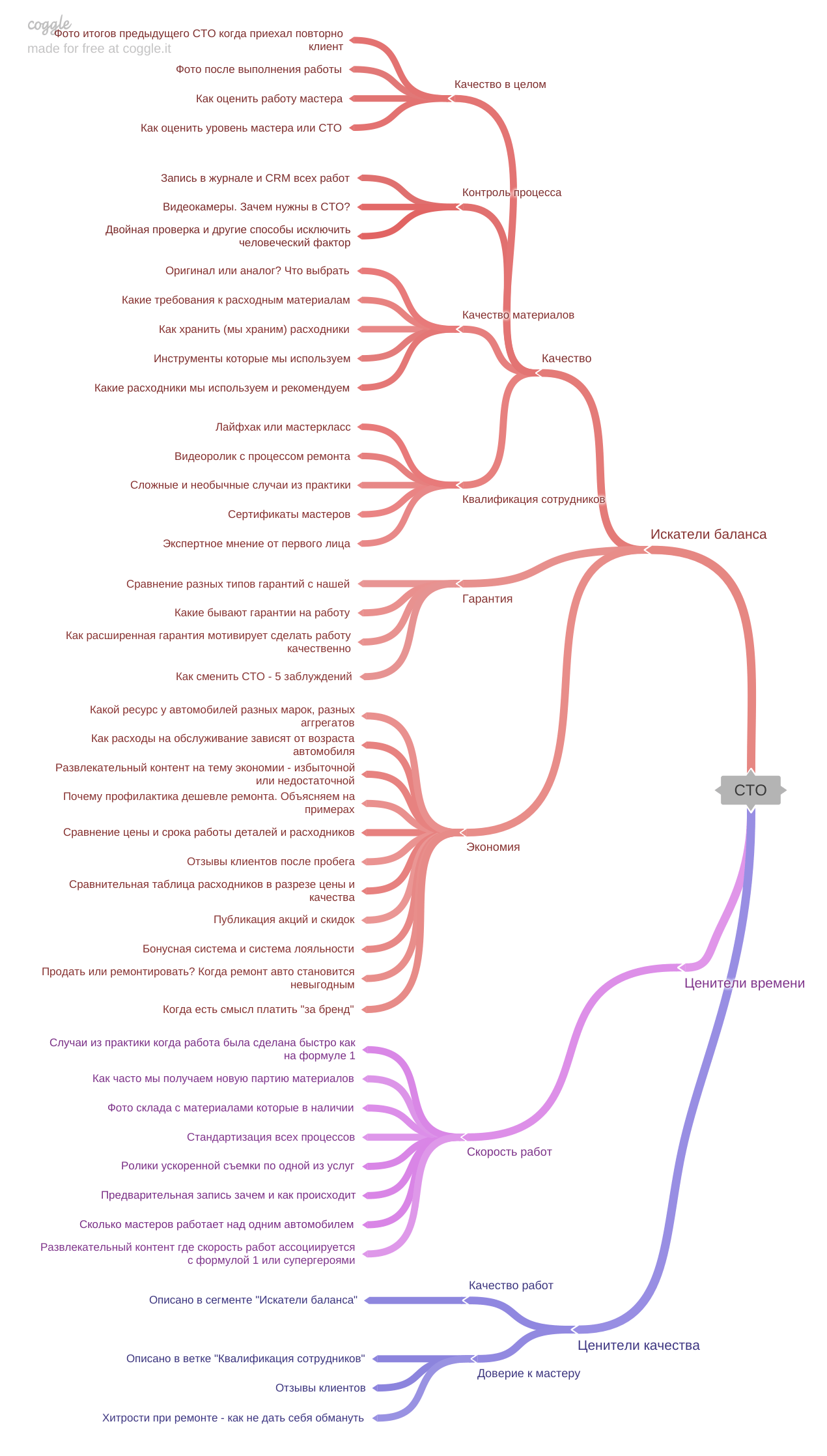 Чтобы получить список тематик, необходимо вашу тематику разделить на подтематики. В случае с СТО, да и в большинстве других ниш, особенно связанных с услугами, основные запросы клиента лежат в плоскости: качество, стоимость и сроки. Где-то на первом месте качество (СТО, маркетинг, медицина), где-то сроки (доставка пиццы, уборка, такси). В неуникальных услугах и товарах обычно на первом месте цена. В любом случае человек всегда выбирает продукт, исходя из этих трех параметров, основываясь на своих внутренних предпочтениях и особенностях ниши.
